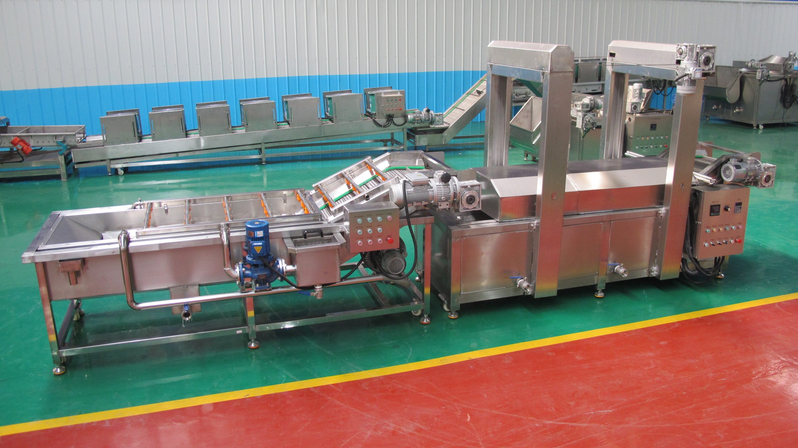 The vegetable bubble washing line is composed of the feeding machine, bubble washing machine, blanching machine, and select workstations etc, and it is mainly used for the washing and blanching of the leafy vegetables or diced root vegetables (strips or slices).