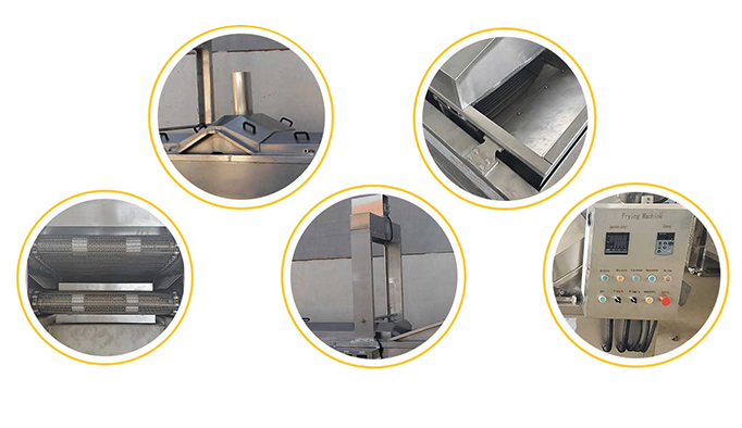 A continuous frying machine consists of a heating system, lifting system, conveying system, automatic slag scraping system, circulation system, and smoke exhaust system.