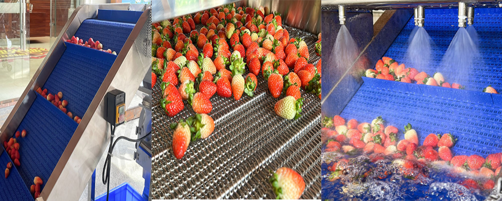 All machines in the line are constructed with food-grade stainless steel and are easy to clean and maintain. The system is particularly suitable for facilities producing frozen strawberries, dried fruit slices, or pre-processed berries for bakery or snack applications. The layout and capacity of the line can be customized to meet specific production requirements.